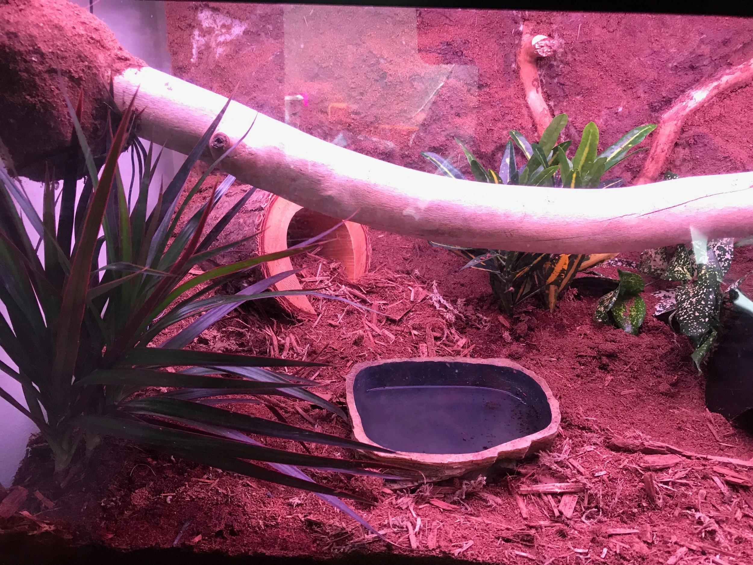 And that’s the whole process! You should wait at least 24 hours before flipping your tank right side up so the silicone has enough time to cure. Then you can plant all of your plants and finish putting the substrate all over the bottom and VIOLA, you have a complete tank. Though we ran into some issues along the way, like the silicone choking us out and the coco fiber not sticking, all in all, the process was really fun. It’s nice to be able to make the tank whatever you want it to be for your animal. We did all of our touch-ups and let our plants take root for a couple of days and then we got a beautiful banana fire ball python to occupy it. His name is Jebediah and though he hasn’t told me himself, I’m pretty sure he rather enjoys his new home.