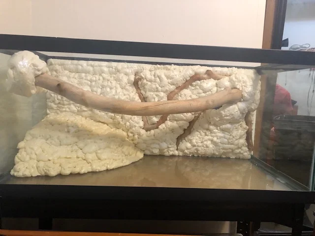 Once you have waited for the foam to dry ( takes about 8 hours) you need to carve down all of your foam so its shinier, smoother surface is no longer there. It should have holes throughout and feel rough like styrofoam once you are done. This is because the silicone sticks better to that surface. We use a serrated kitchen knife to cut ours. We first bought a spackling knife for the job but it didn’t work very well as it wasn't sharp enough to pierce through the foam. So since you’re using knives here, it probably goes without saying but please be careful. Also, this step is why I mentioned a bigger tank being easier for this project as it could be hard to get your knife in there and manipulate it around to do your carving.